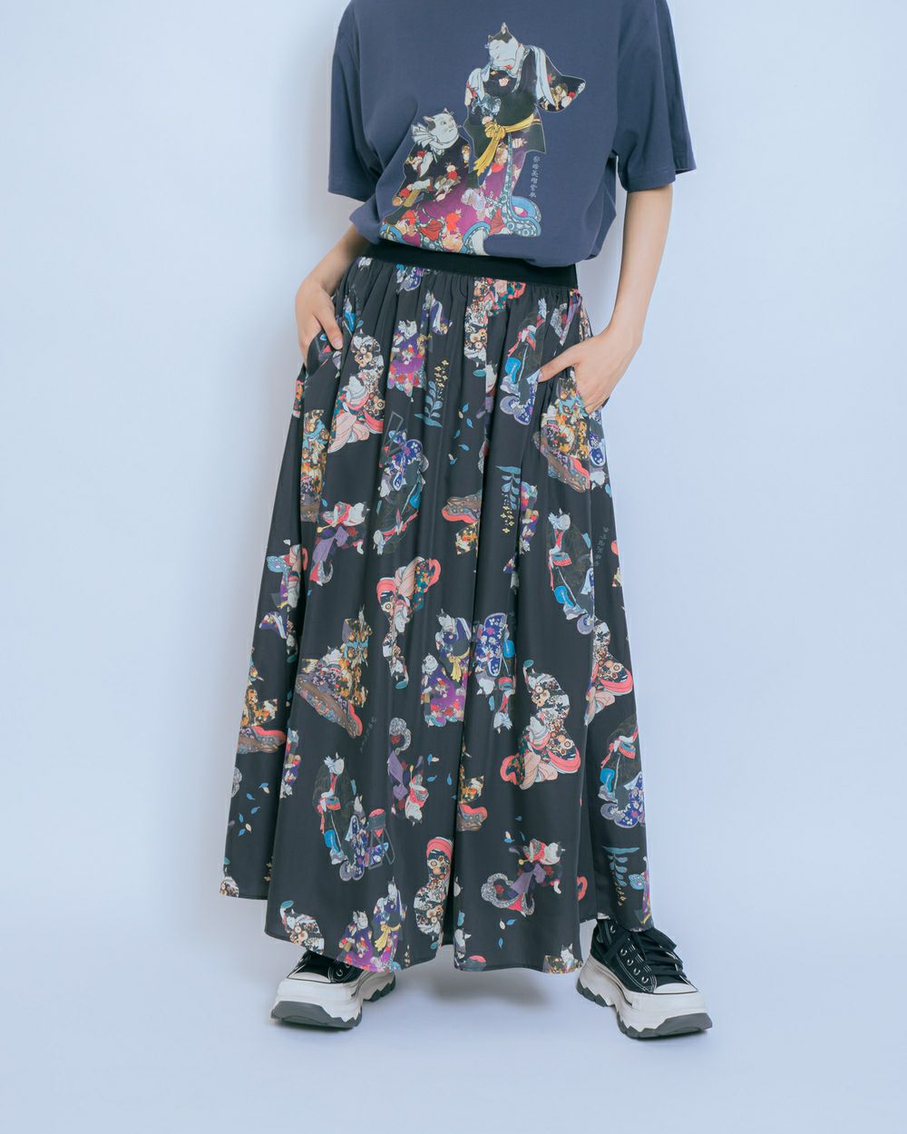 ウエストにツイル調のゴムを使ったギャザースカートです。