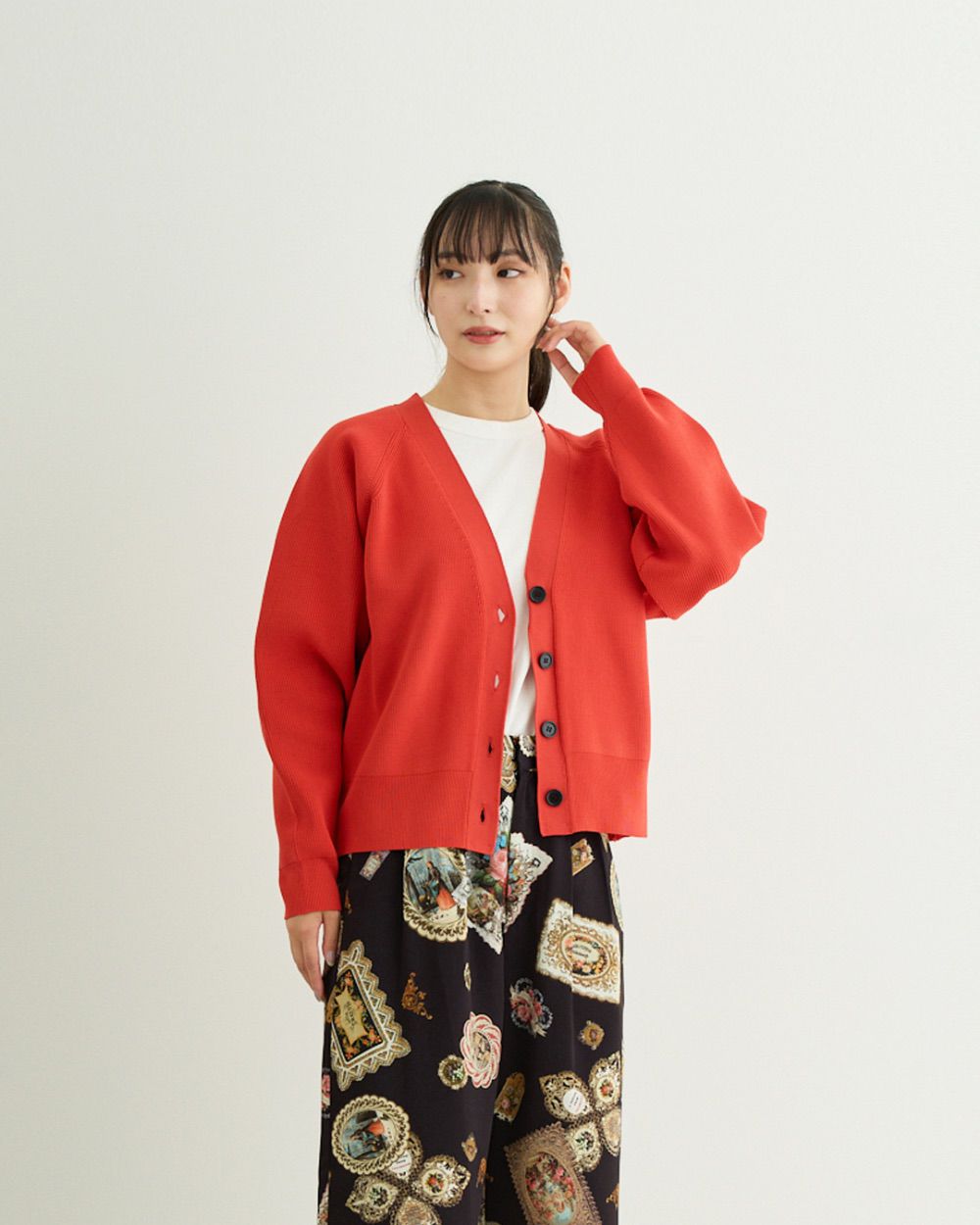 形成されやすい特殊なポリエステル糸を使用したカーディガンになります。